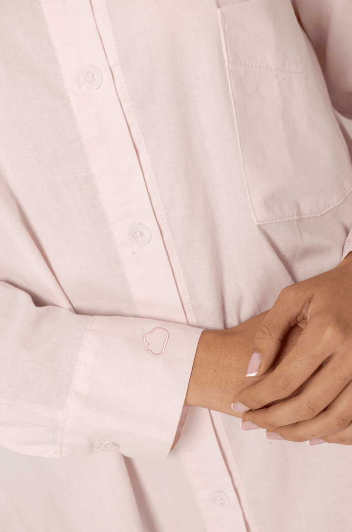 Este camisón cuenta con delicados detalles que lo hacen único: en una de las mangas lleva bordado el ícono de la marca, una nube que simboliza suavidad y confort, y en la otra manga la frase inspiradora “rest is a ritual”, un recordatorio de que el descanso también es parte esencial de tu bienestar.