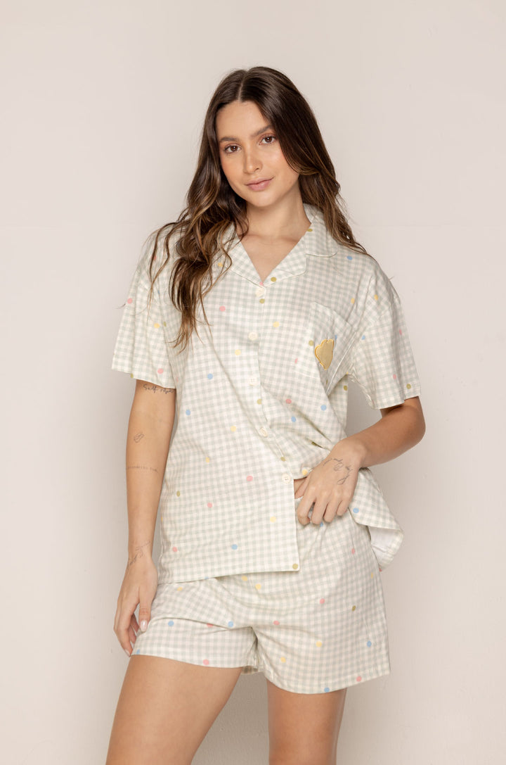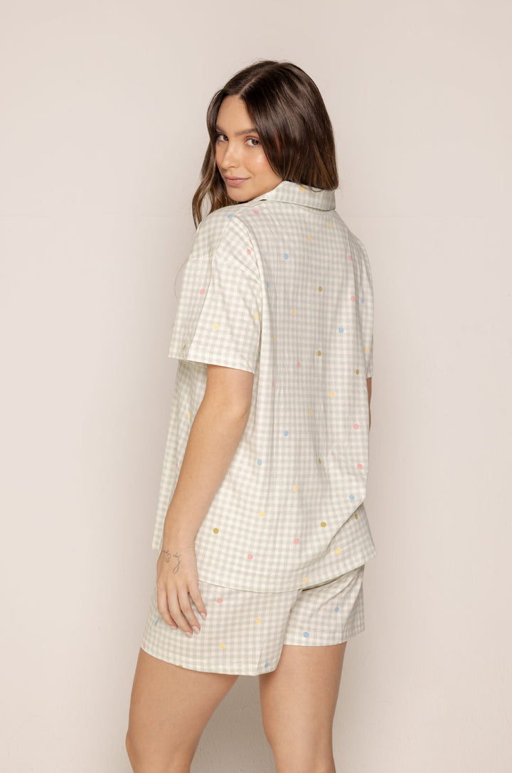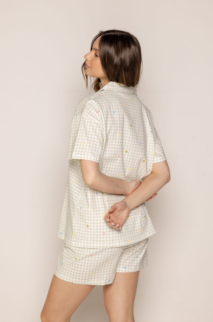 El diseño presenta un estampado alegre de cuadritos verdes y blancos, acompañado de puntos coloridos y divertidos que le dan un toque moderno y juvenil. Cada detalle está pensado para aportar personalidad sin sacrificar la elegancia clásica de una buena pijama.