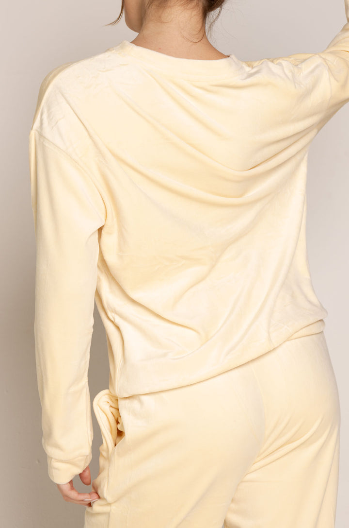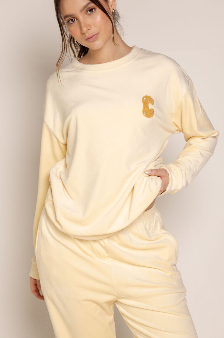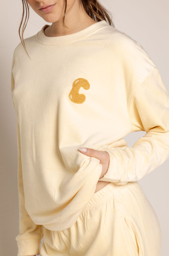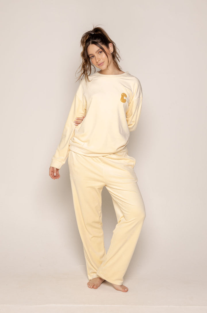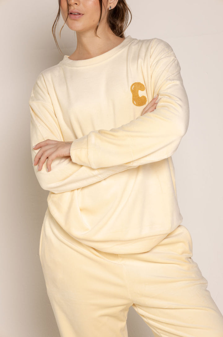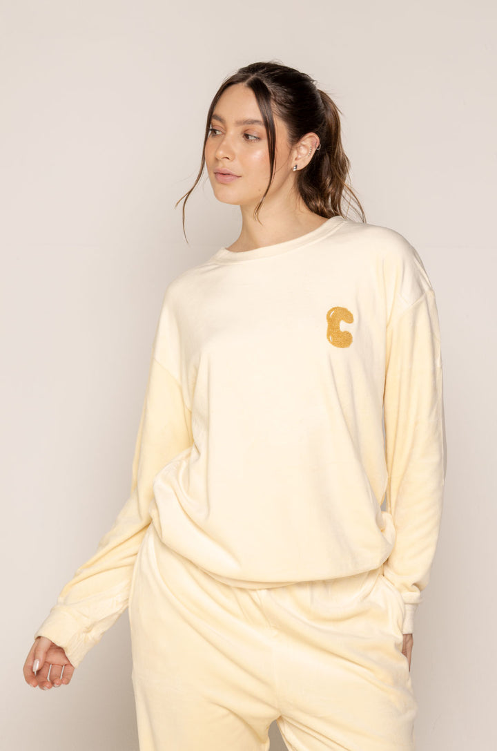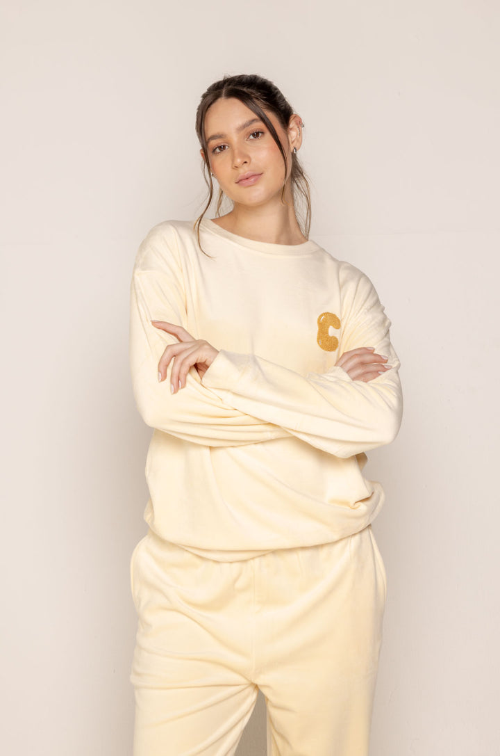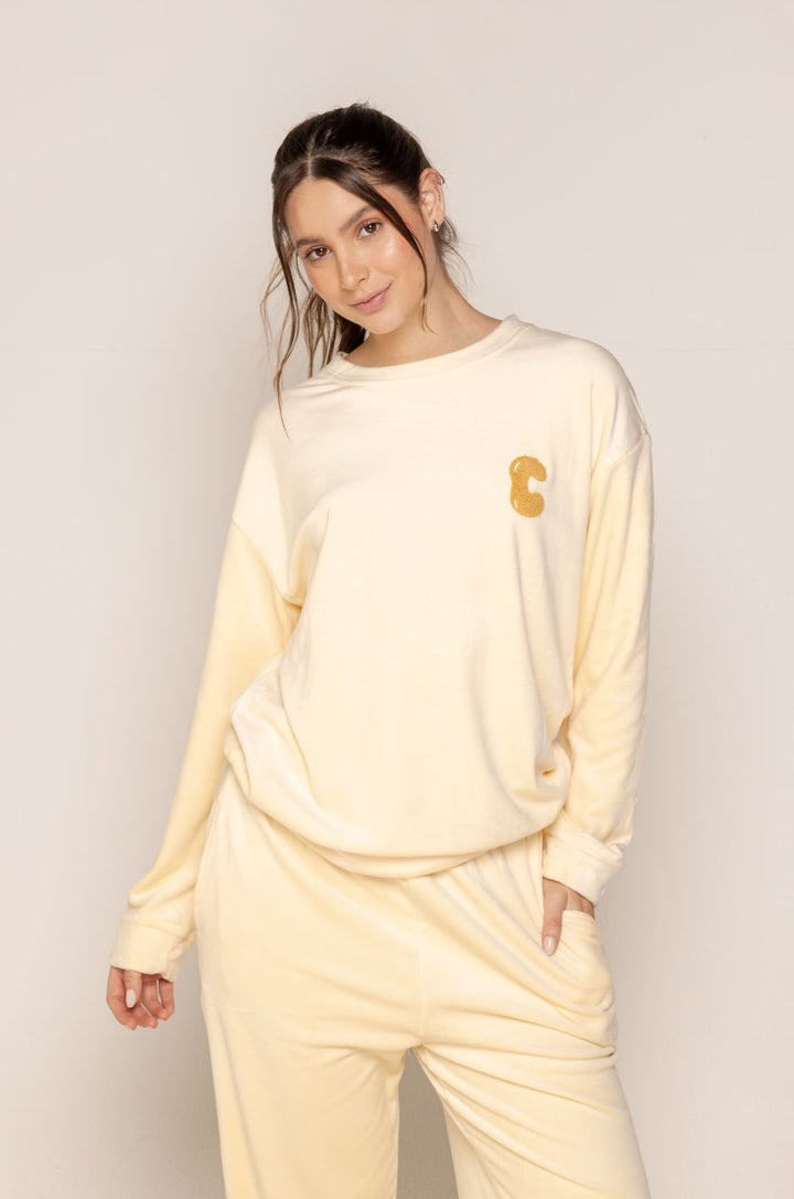 El diseño en amarillo pastel aporta un toque dulce y femenino, mientras que el detalle más especial se encuentra en el pecho: una letra “C” bordada, distintiva de Cozzzy, que añade personalidad y un acabado premium.