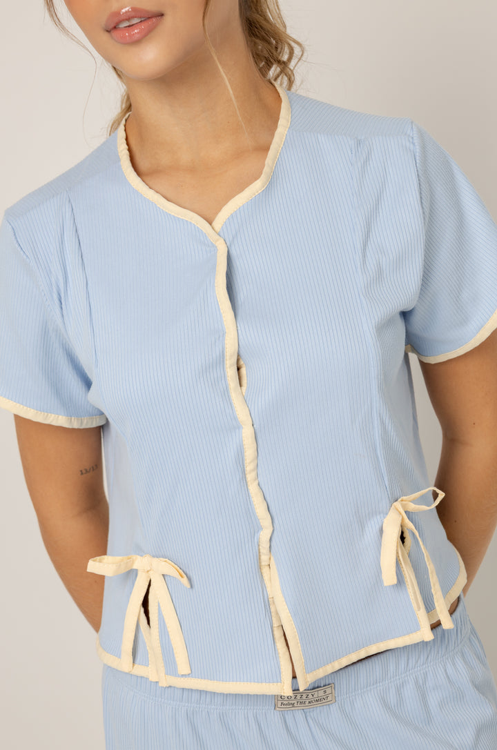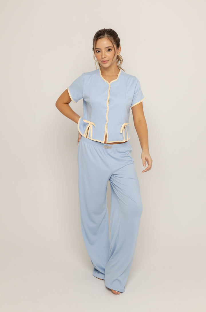 Su camisa corta presenta botones internos y encantadores moños en los laterales, que resaltan en un juego de colores pasteles con contrastes sutiles.