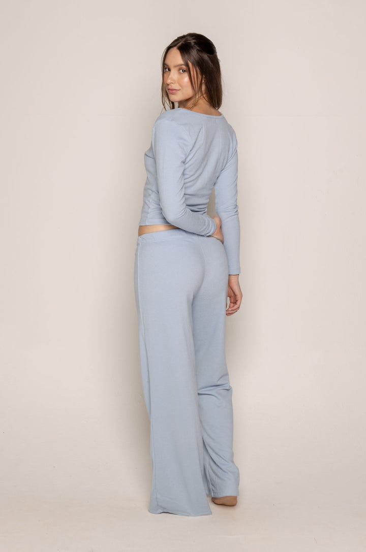El pantalón de bota ancha aporta un look relajado y fluido, ideal para quienes aman las prendas cómodas pero con estilo. Incluye botoncitos decorativos en la pretina, un detalle sutil que realza su diseño y le da un acabado delicado y femenino.