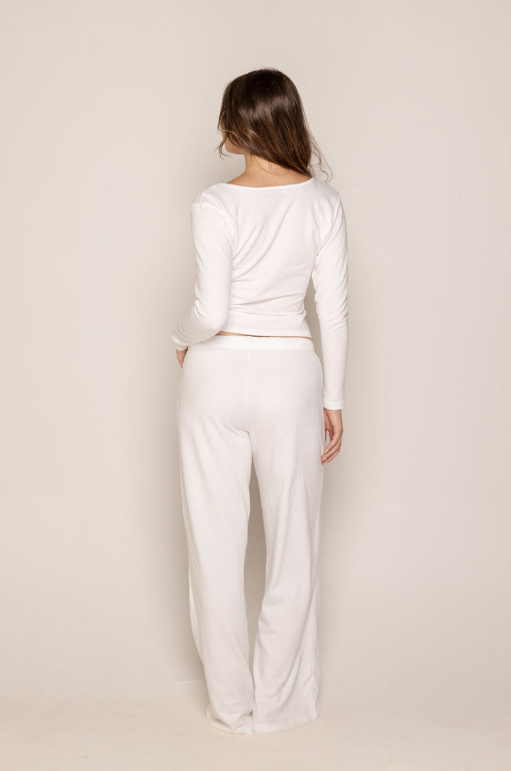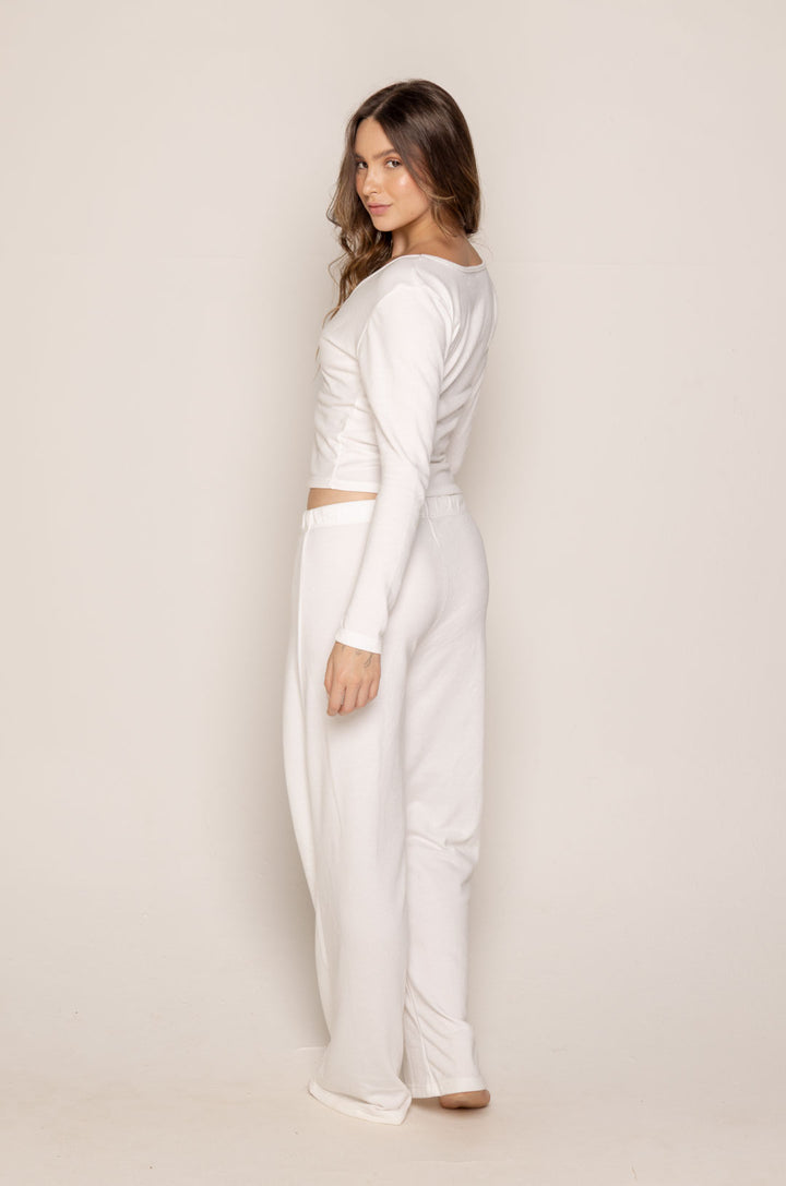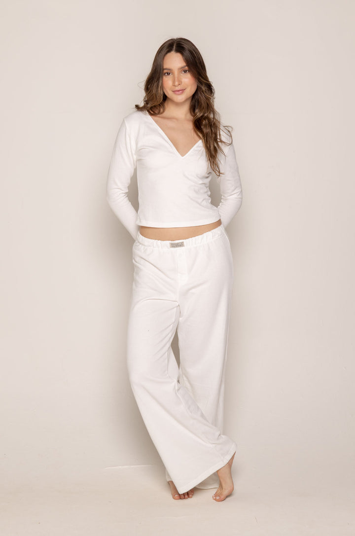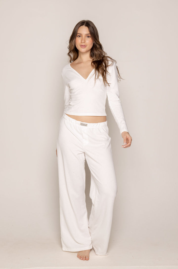 Comodidad moderna y estilo minimalista se unen en nuestra pijama Gaby de pantalón bota ancha, diseñada para ofrecer libertad de movimiento y una silueta elegante. Confeccionada en polialgodón suave, esta pijama combina la frescura del algodón con la elasticidad del poliéster, logrando una textura ligera, cómoda y perfecta para el uso diario.