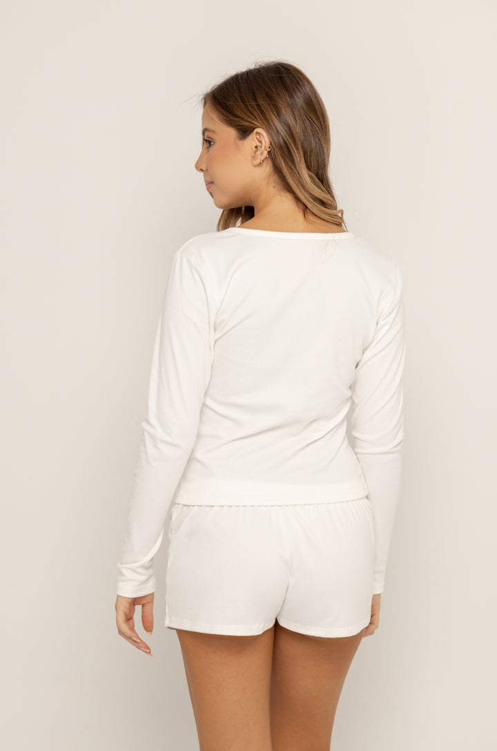 Pijama fabricada en Rib Lyrcrado, 60% Algodón y 40% poliester, Camibuso con detalles en botones, Tela suave, fresca y muy cómoda, Cintura con elástico, Hecho responsablemente en Medellín Colombia. La modelo usa talla S y mide 1,78.
