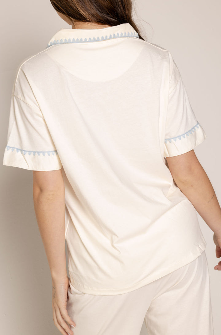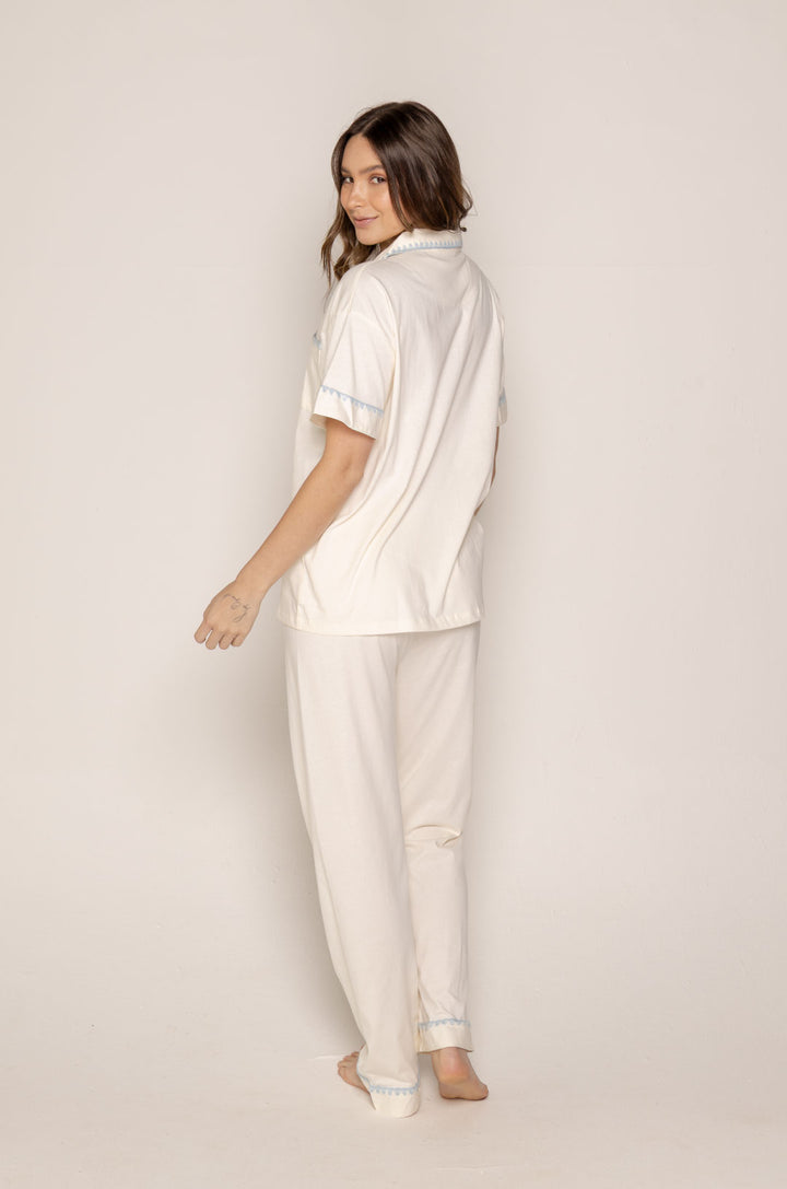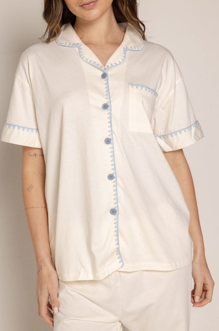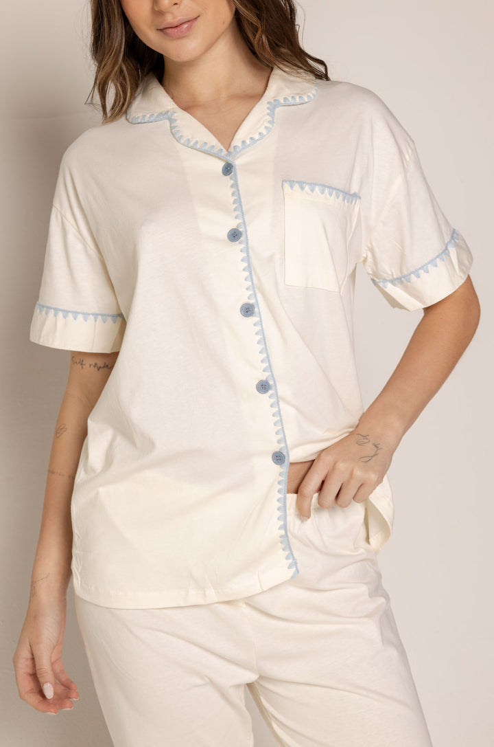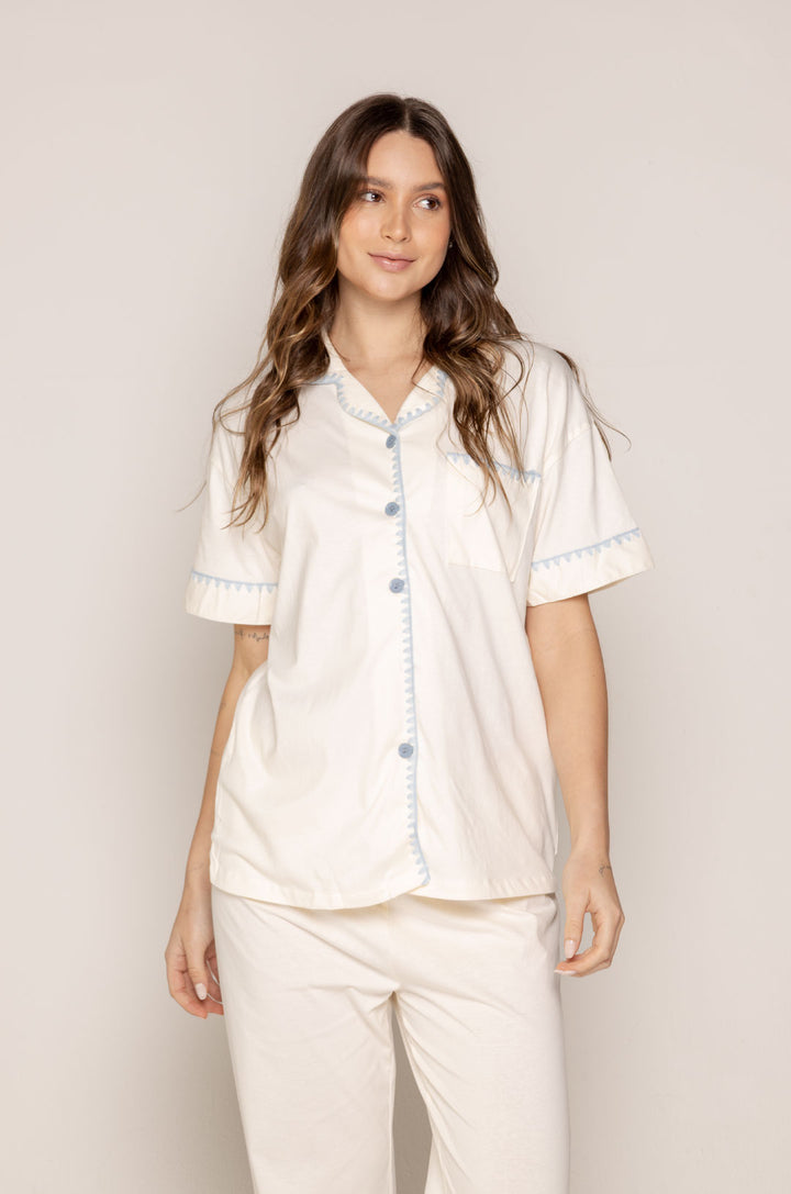 La camisa presenta un diseño abotonado tradicional, ideal para quienes prefieren una pijama práctica y atemporal. Sus bordes decorados con un bordado triangular en tono azul suave añaden un toque femenino y artesanal que eleva el look sin perder sencillez.