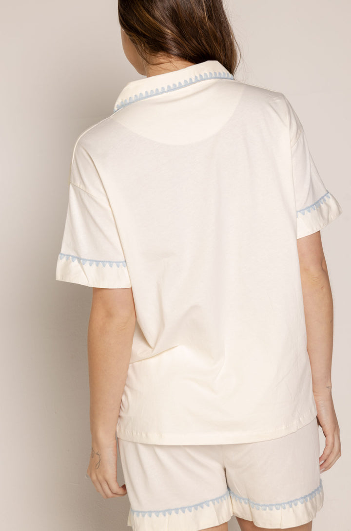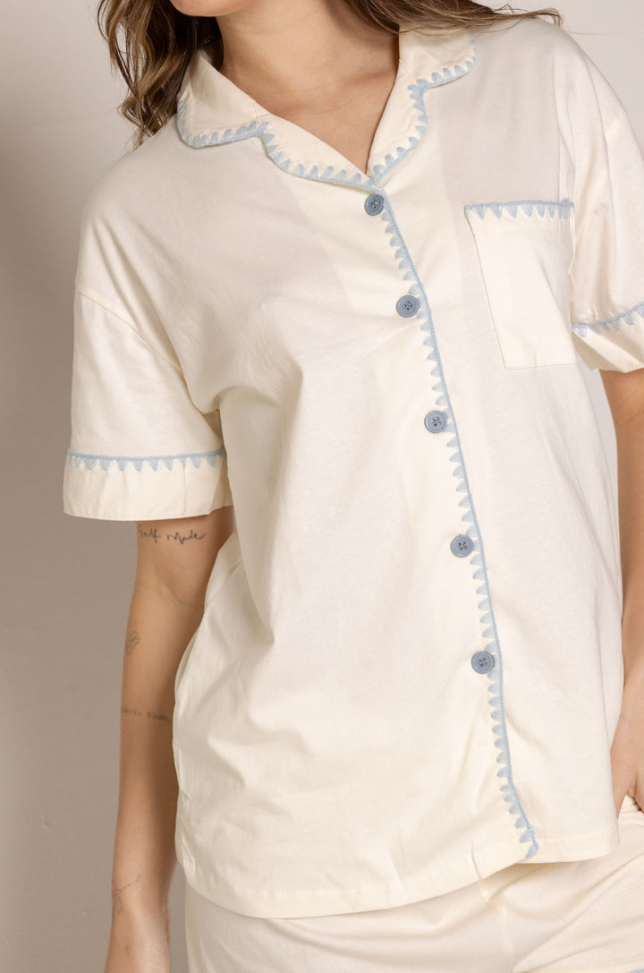 La camisa presenta un diseño abotonado tradicional, ideal para quienes prefieren una pijama práctica y atemporal. Sus bordes decorados con un bordado triangular en tono azul suave añaden un toque femenino y artesanal que eleva el look sin perder sencillez.