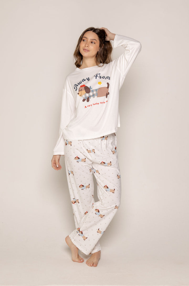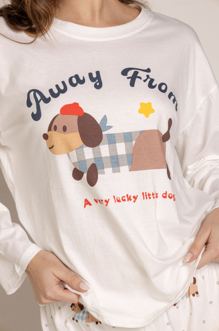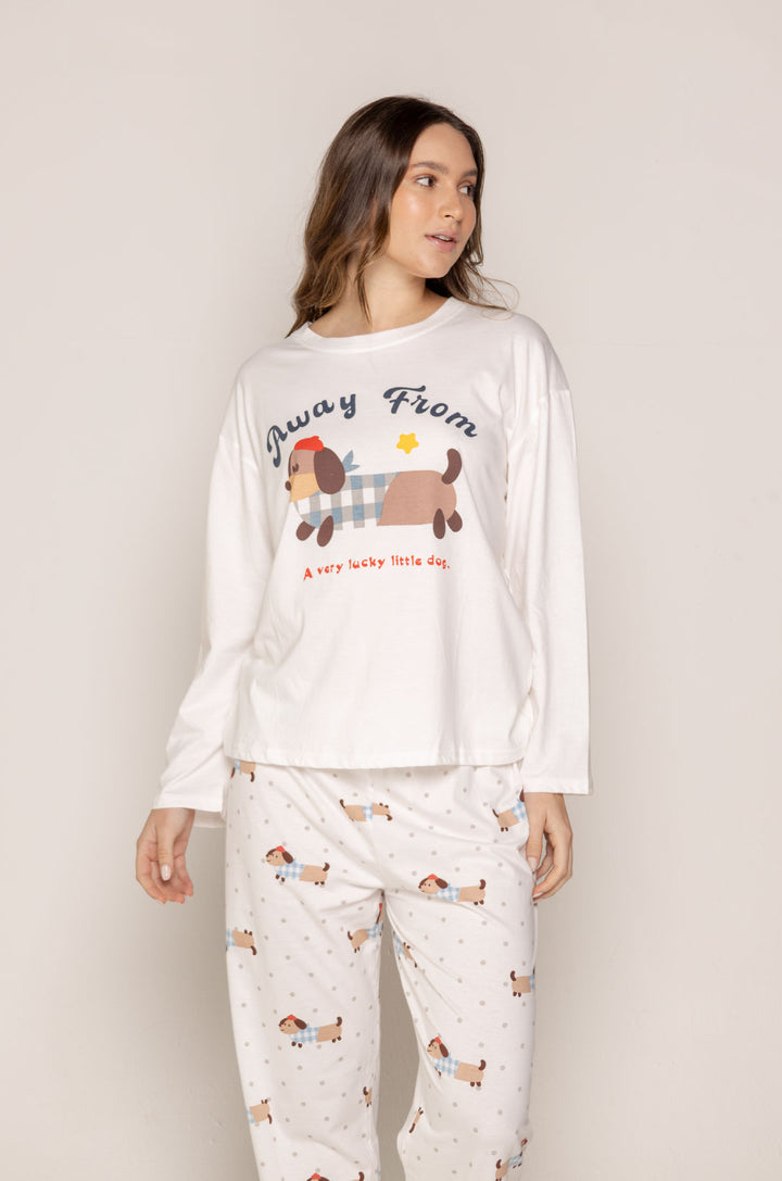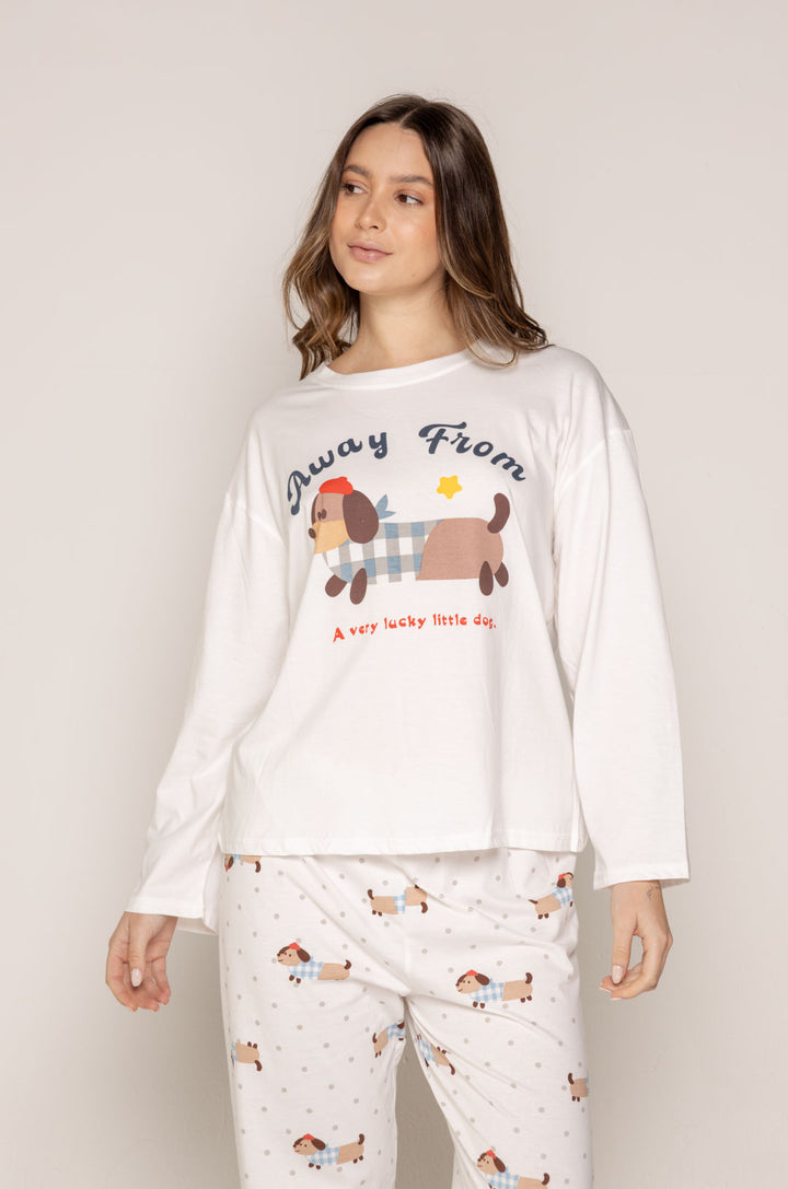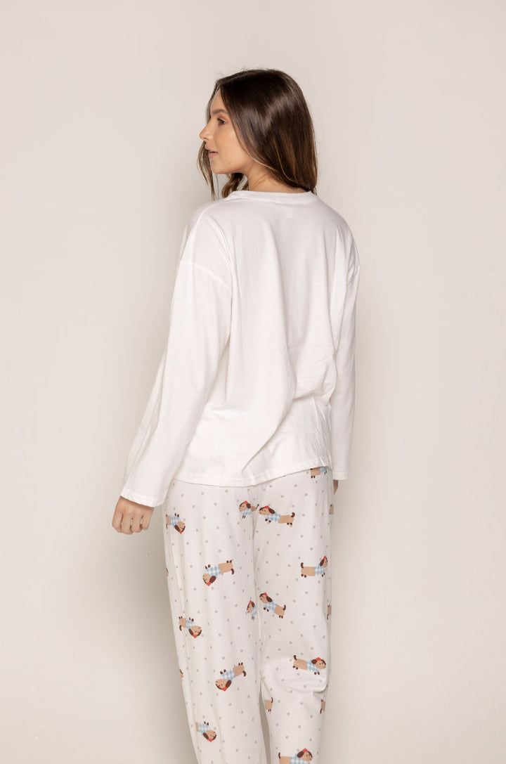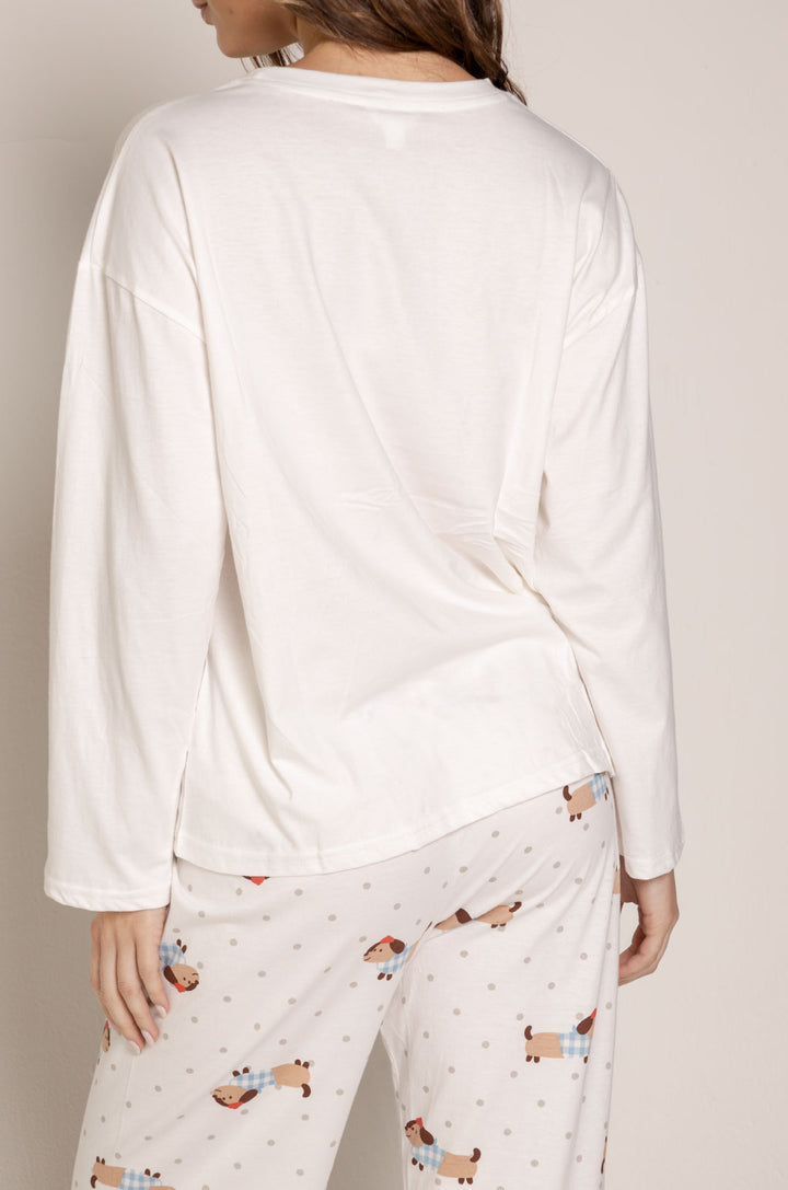 La parte superior, en tono blanco, destaca por su estampado central de un perrito salchicha con textura tipo patchwork, acompañado de una frase dulce y relajada que refuerza su encanto. Su diseño holgado y ligero permite total libertad de movimiento.