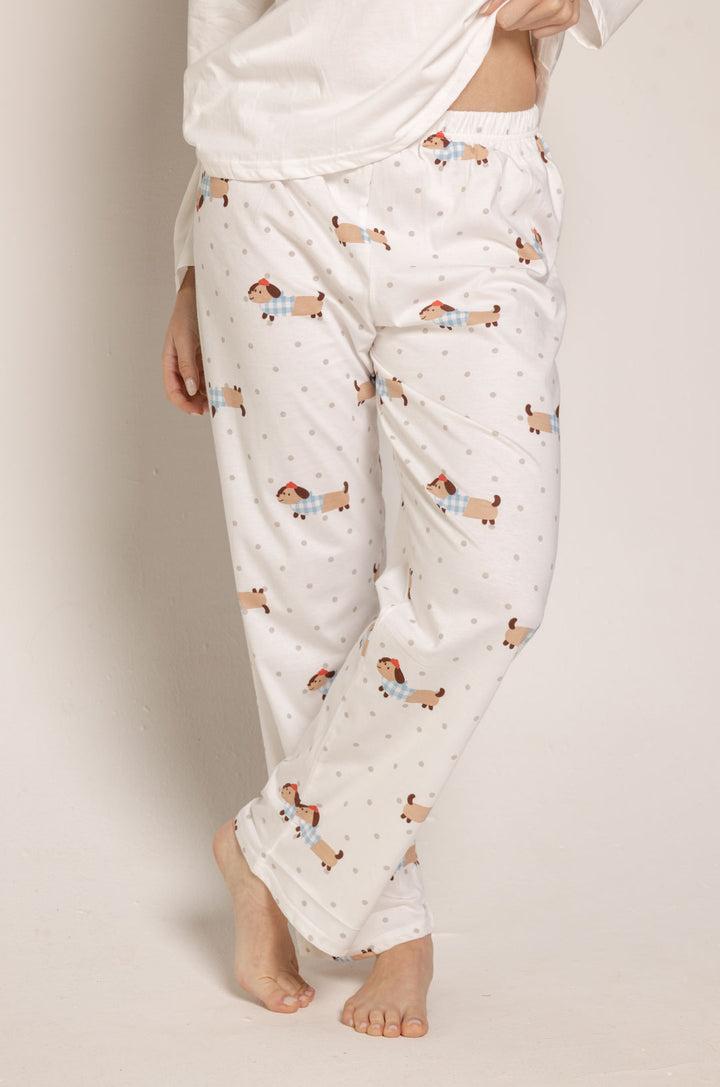 El pantalón combina a la perfección con la temática del conjunto, presentando un estampado completo de perritos salchicha sobre un fondo blanco con pequeños lunares, creando un look uniforme, tierno y divertido.