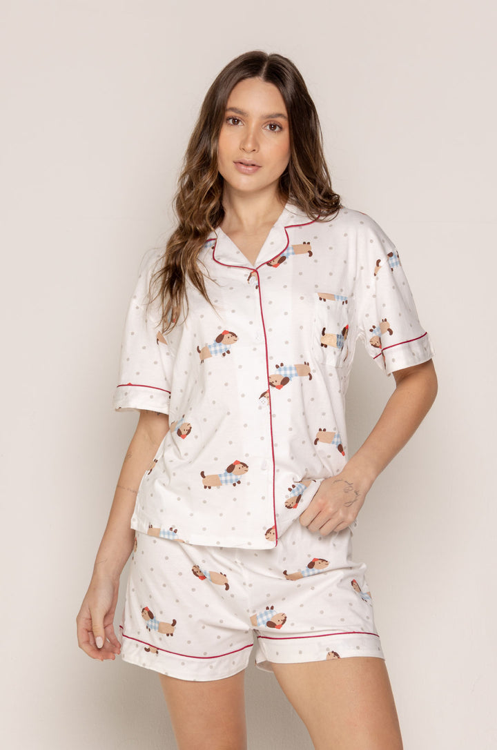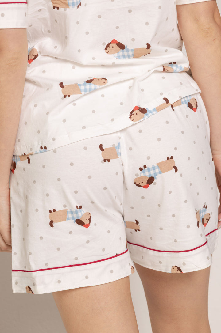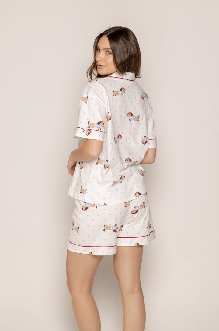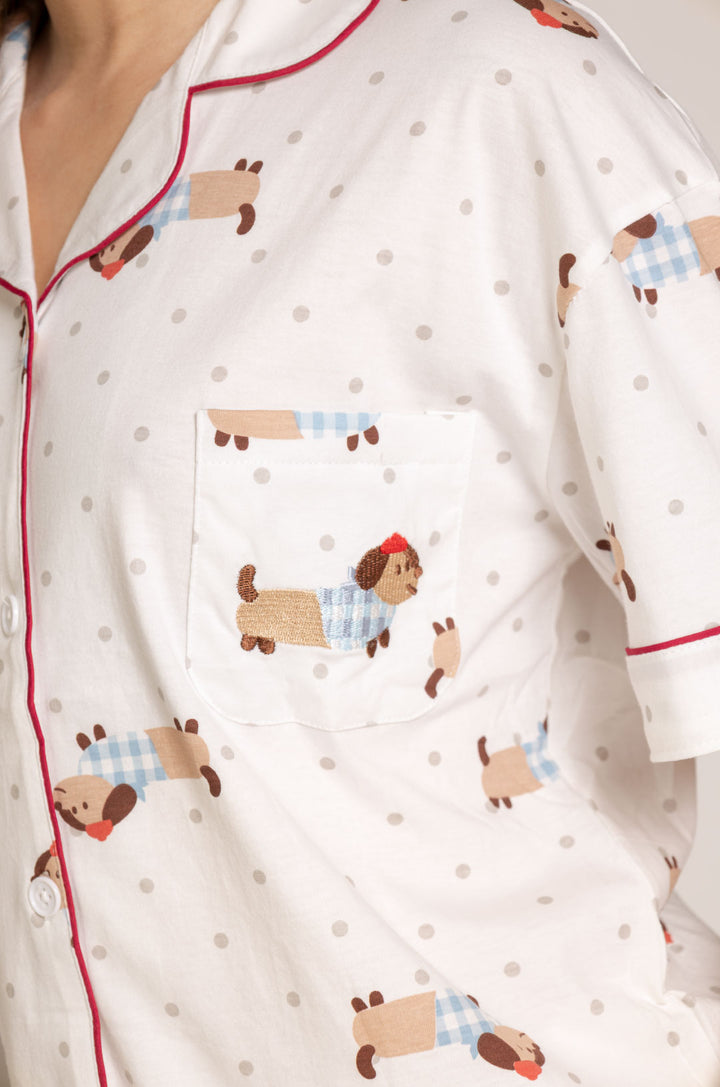 Su diseño en tono blanco con pequeños lunares sirve de fondo perfecto para el adorable estampado de perritos salchicha, que aporta personalidad y encanto.