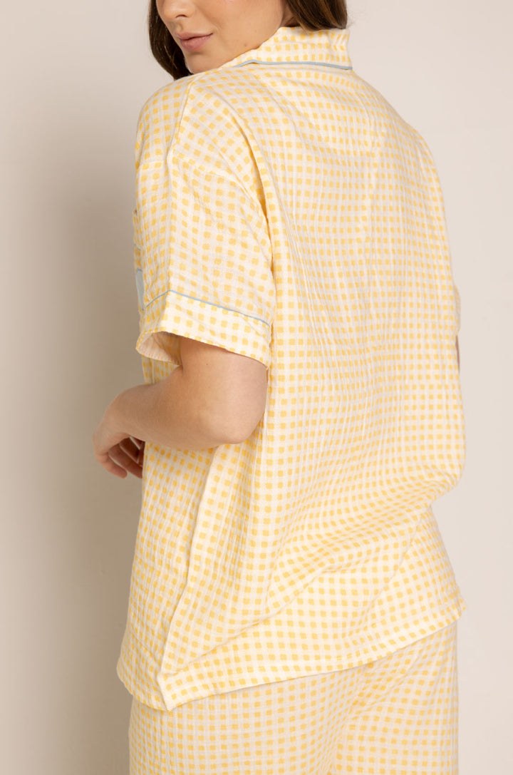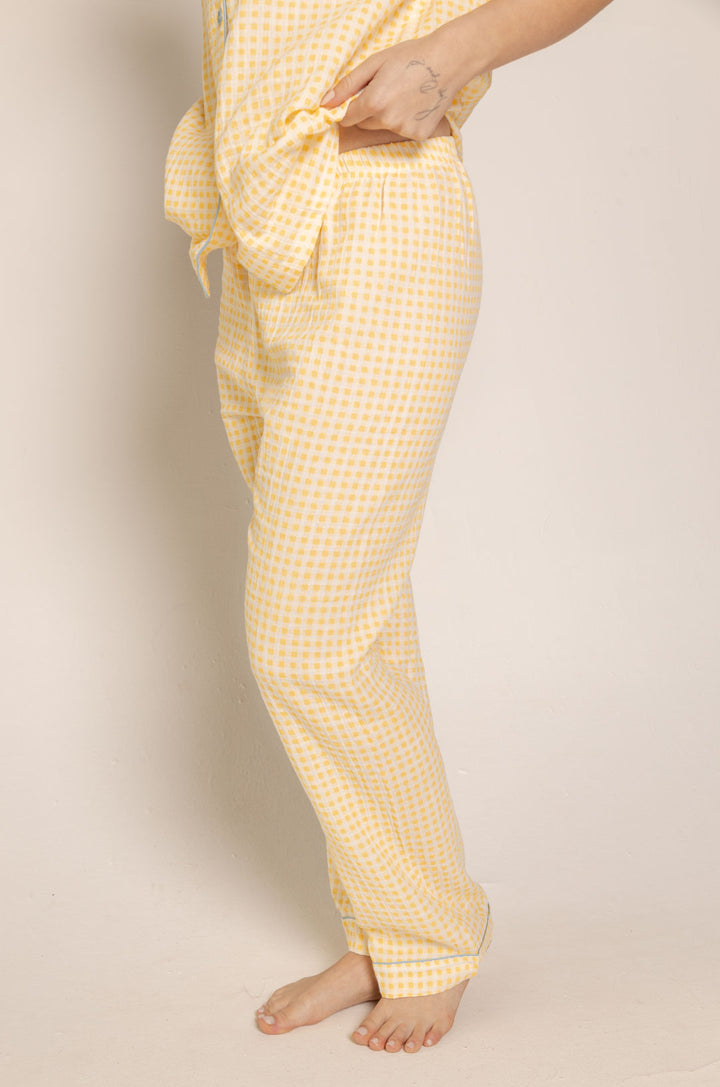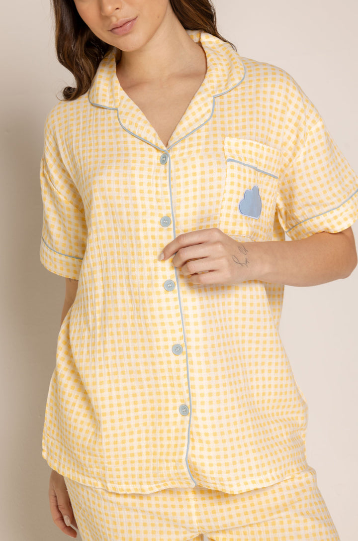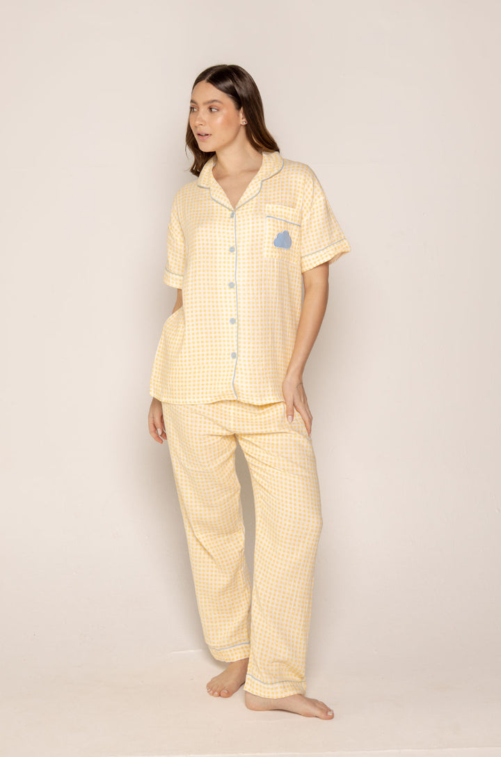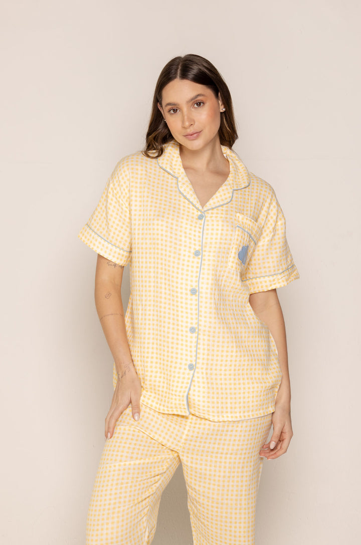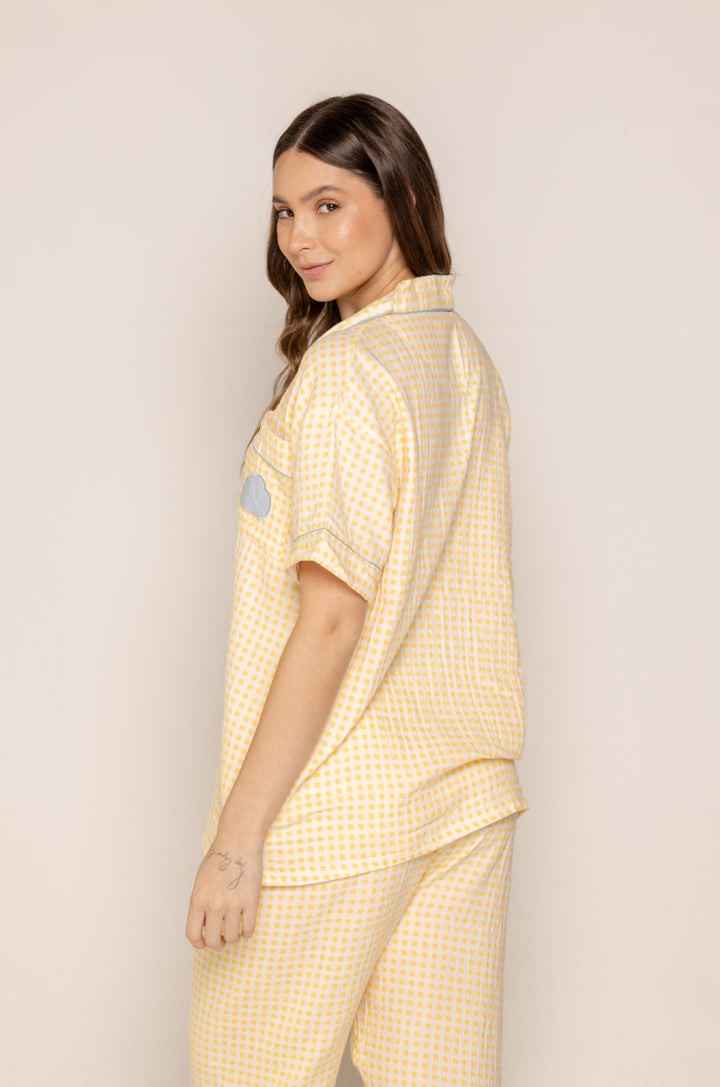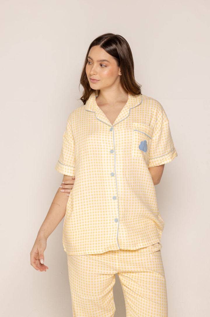 El diseño presenta un estampado delicado de cuadritos amarillos y blancos, un look luminoso, dulce y atemporal que aporta un aire limpio y acogedor. Es la pijama perfecta para quienes aman los básicos con un toque especial.