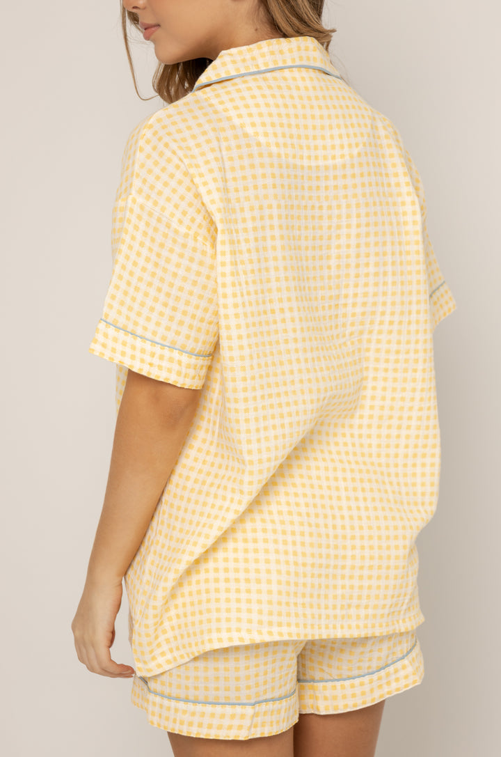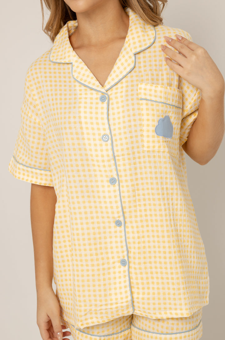 El diseño presenta un estampado delicado de cuadritos amarillos y blancos, un look luminoso, dulce y atemporal que aporta un aire limpio y acogedor. Es la pijama perfecta para quienes aman los básicos con un toque especial.