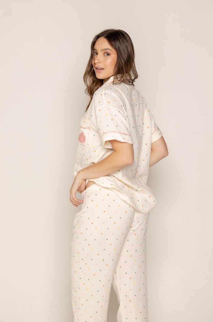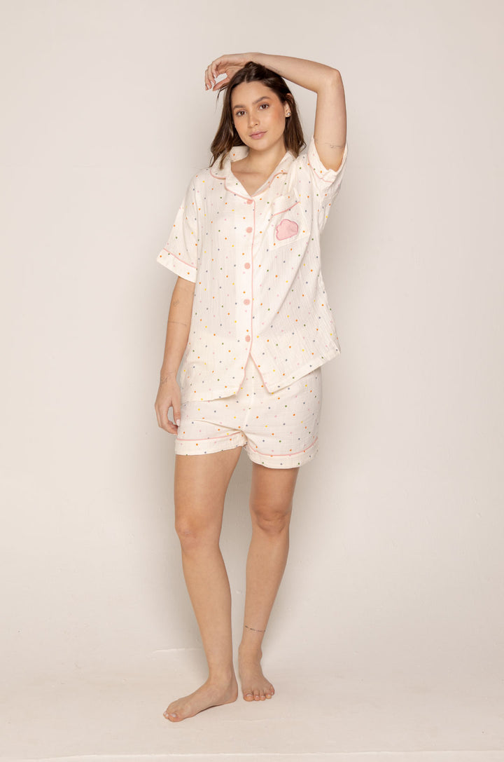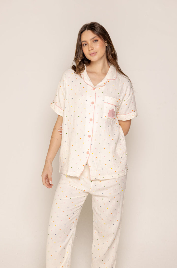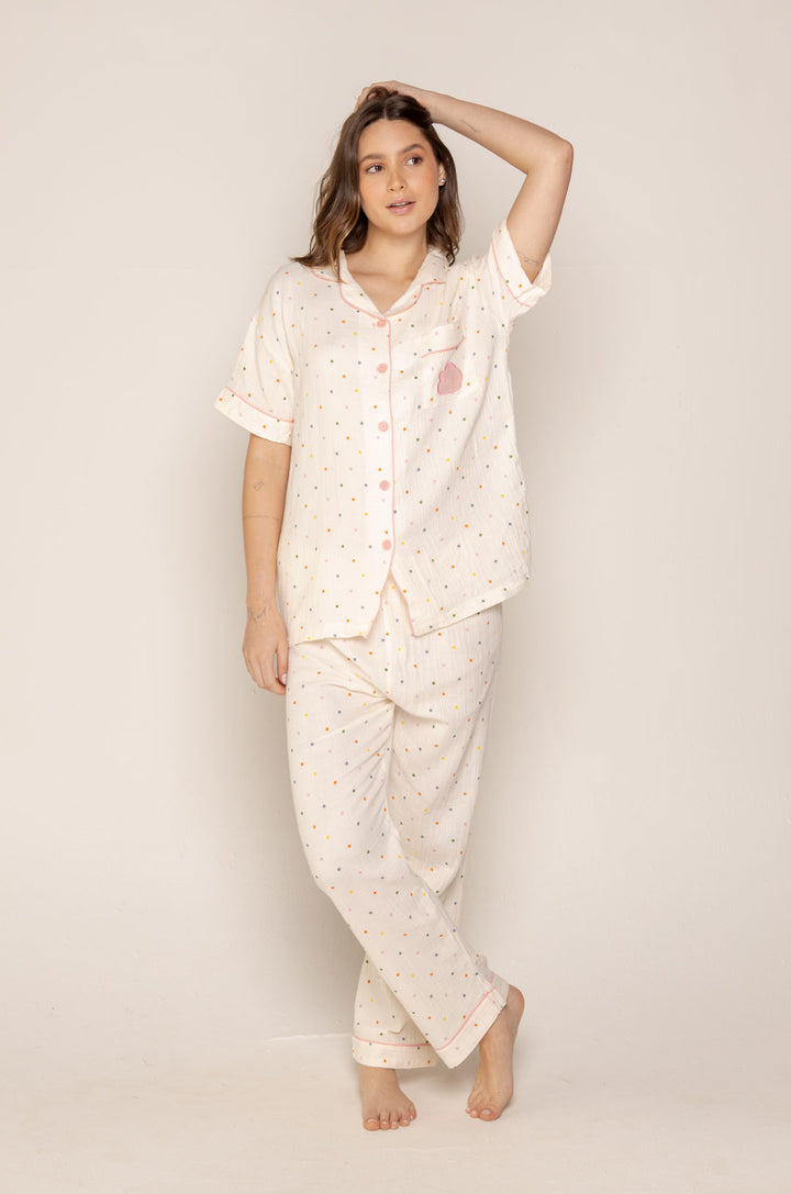 Confeccionado en algodón tipo paño arrugadito, este tejido ofrece una textura suave, ligera y naturalmente relajada que aporta frescura y comodidad a cada movimiento. Su color crema es la base perfecta para un estampado alegre de puntos coloridos y divertidos, que llenan el diseño de energía y personalidad.