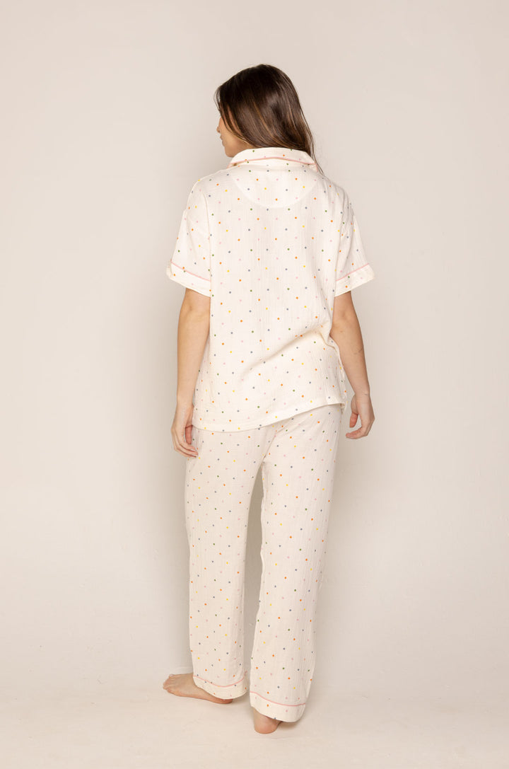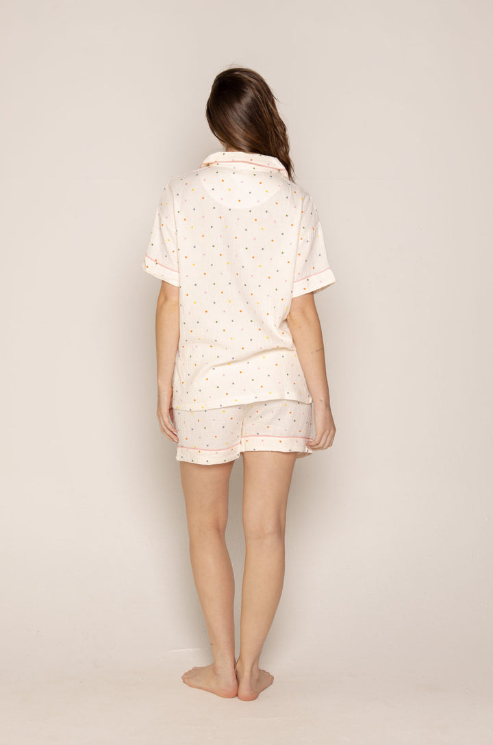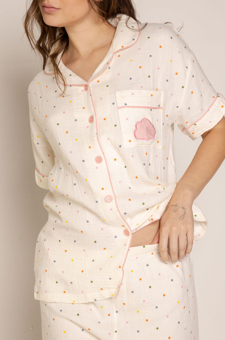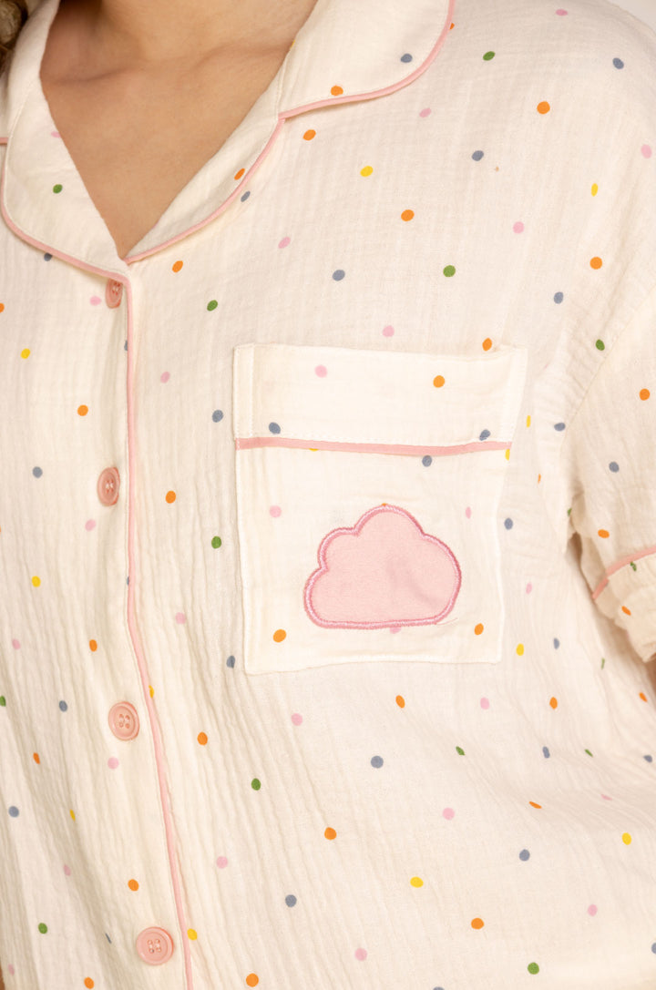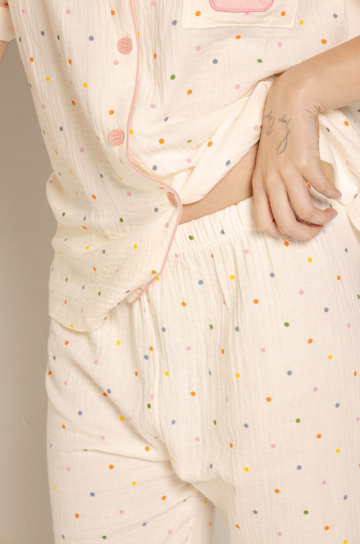 Confeccionado en algodón tipo paño arrugadito, este tejido ofrece una textura suave, ligera y naturalmente relajada que aporta frescura y comodidad a cada movimiento. Su color crema es la base perfecta para un estampado alegre de puntos coloridos y divertidos, que llenan el diseño de energía y personalidad.
