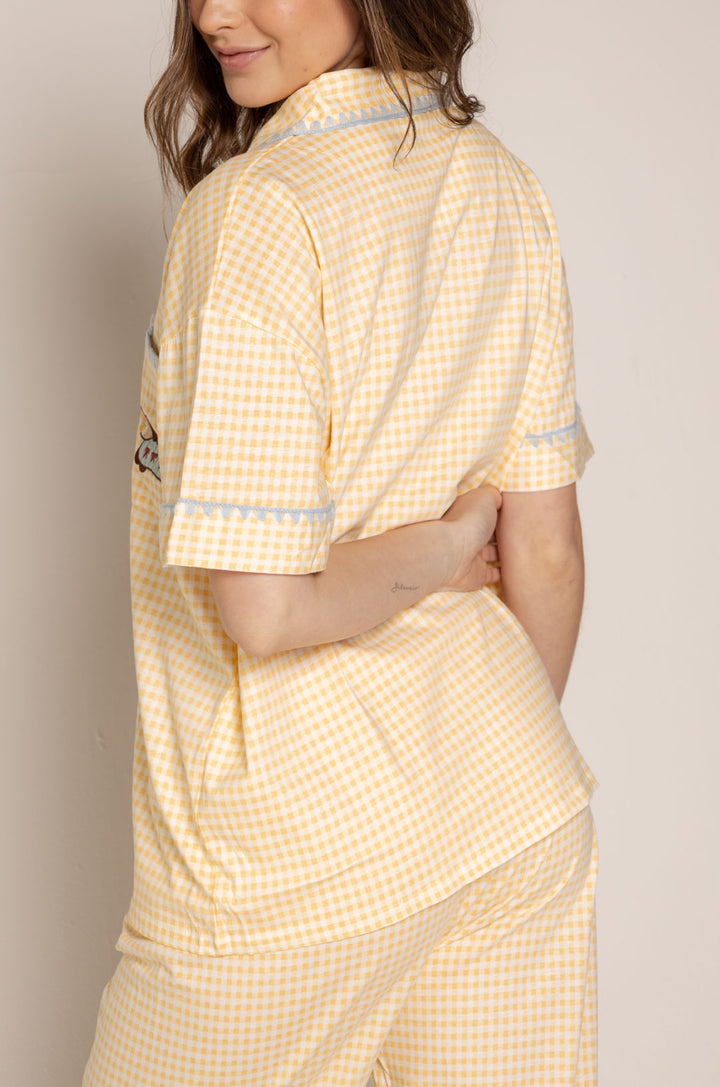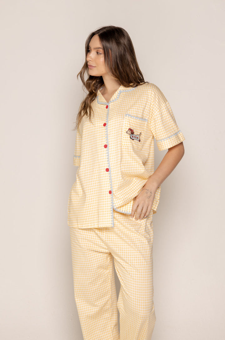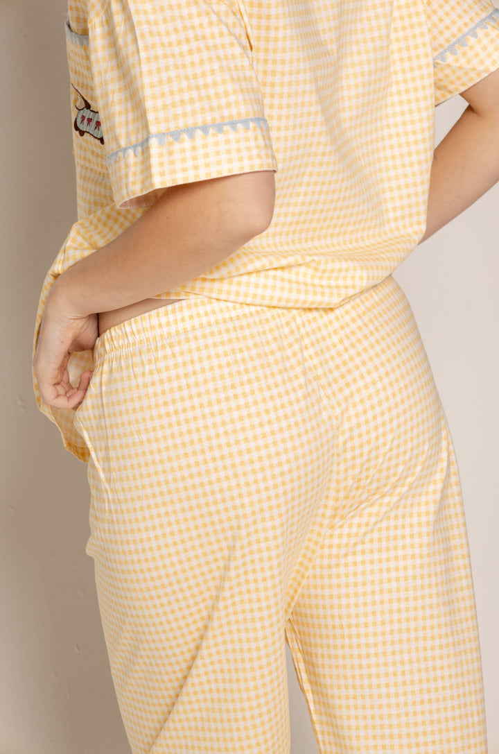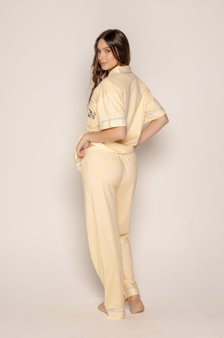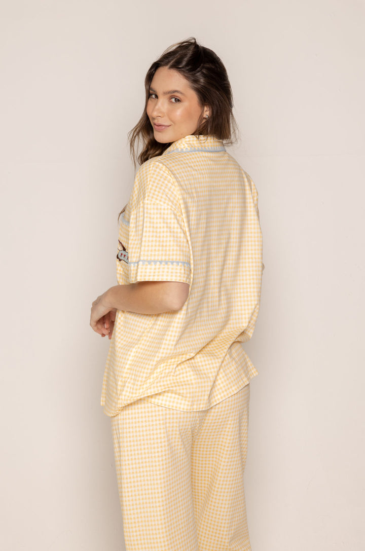 El diseño presenta un estampado vichy en tonos amarillo pastel, creando un look tierno y luminoso. Los detalles son protagonistas: