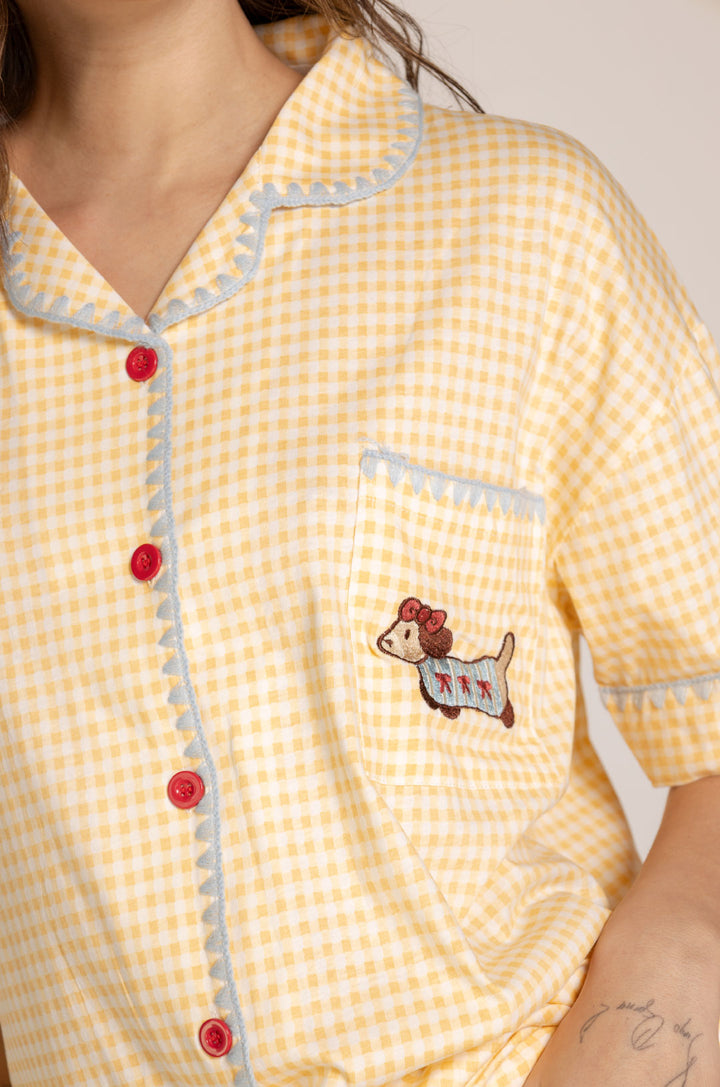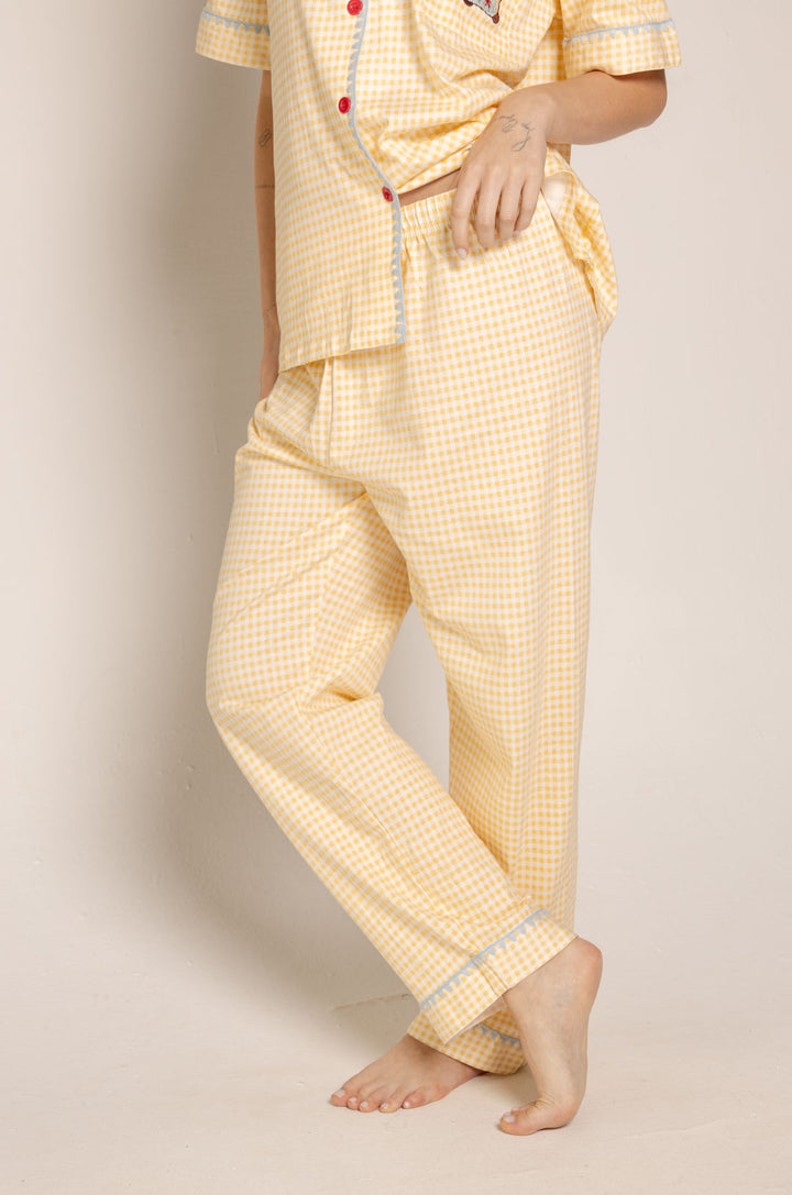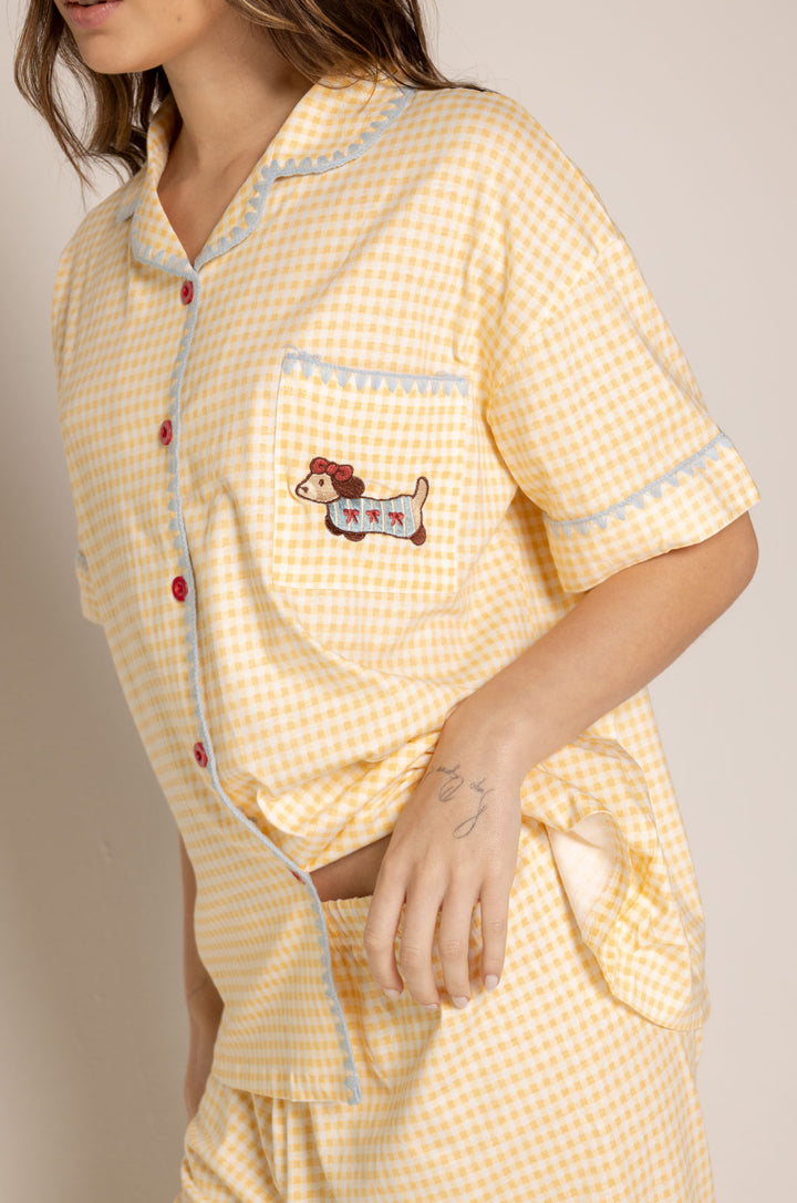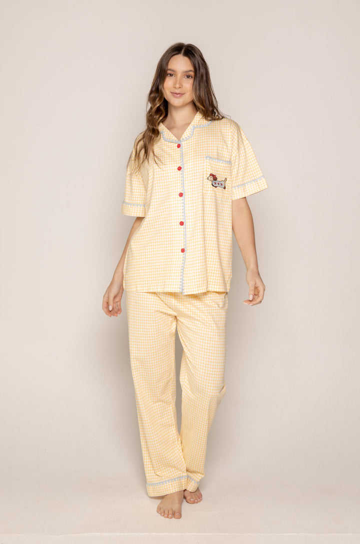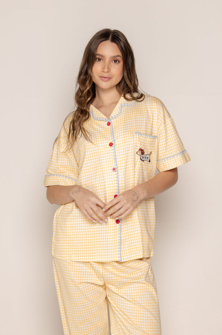 El diseño presenta un estampado vichy en tonos amarillo pastel, creando un look tierno y luminoso. Los detalles son protagonistas: