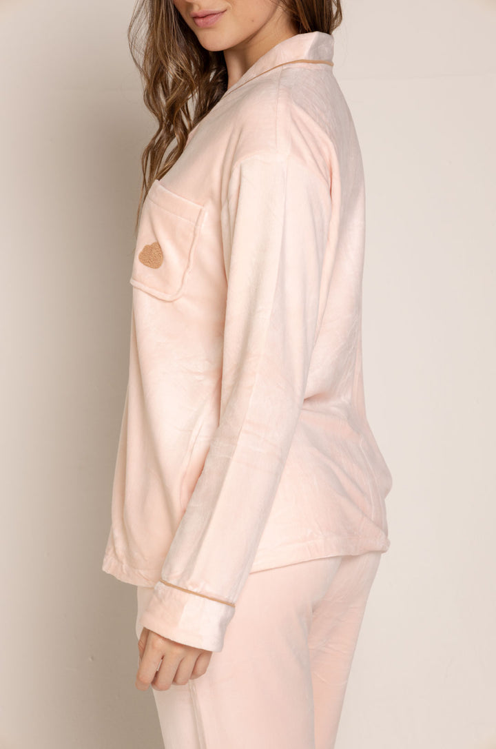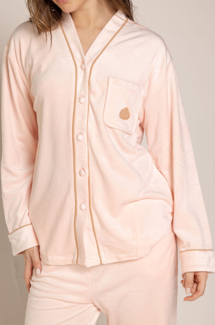 La camisa, de diseño abotonado, aporta un toque clásico y elegante. Está decorada con delicados bordes en color café, que realzan su forma y le dan un acabado sofisticado. Como detalle especial, lleva una nube bordada en el pecho, un elemento tierno y relajante que representa la esencia suave y dreamy de Cozzzy.